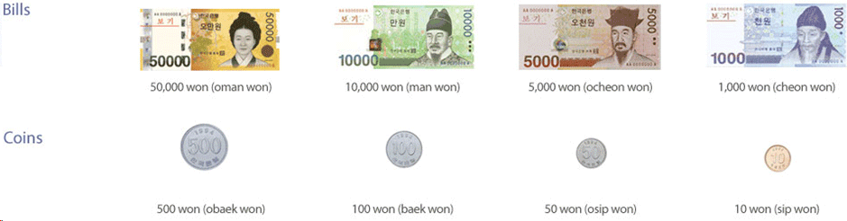 The unit of Korean currency is the won (₩). Coin denominations are ₩10, ₩50, ₩100, and ₩500. Banknotes are ₩1,000, ₩5,000, ₩10,000, and ₩50,000.